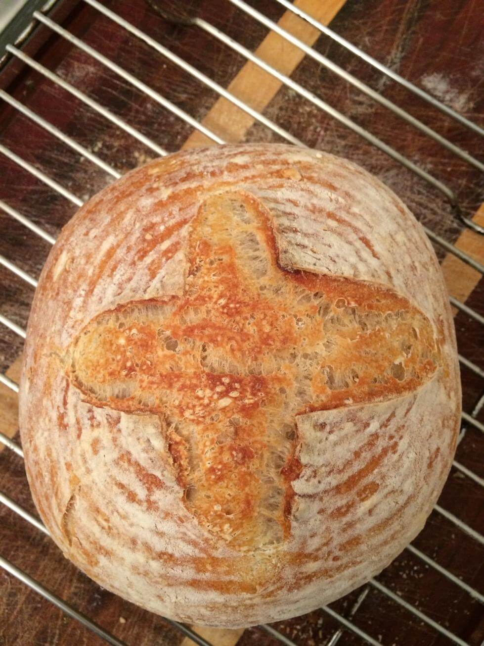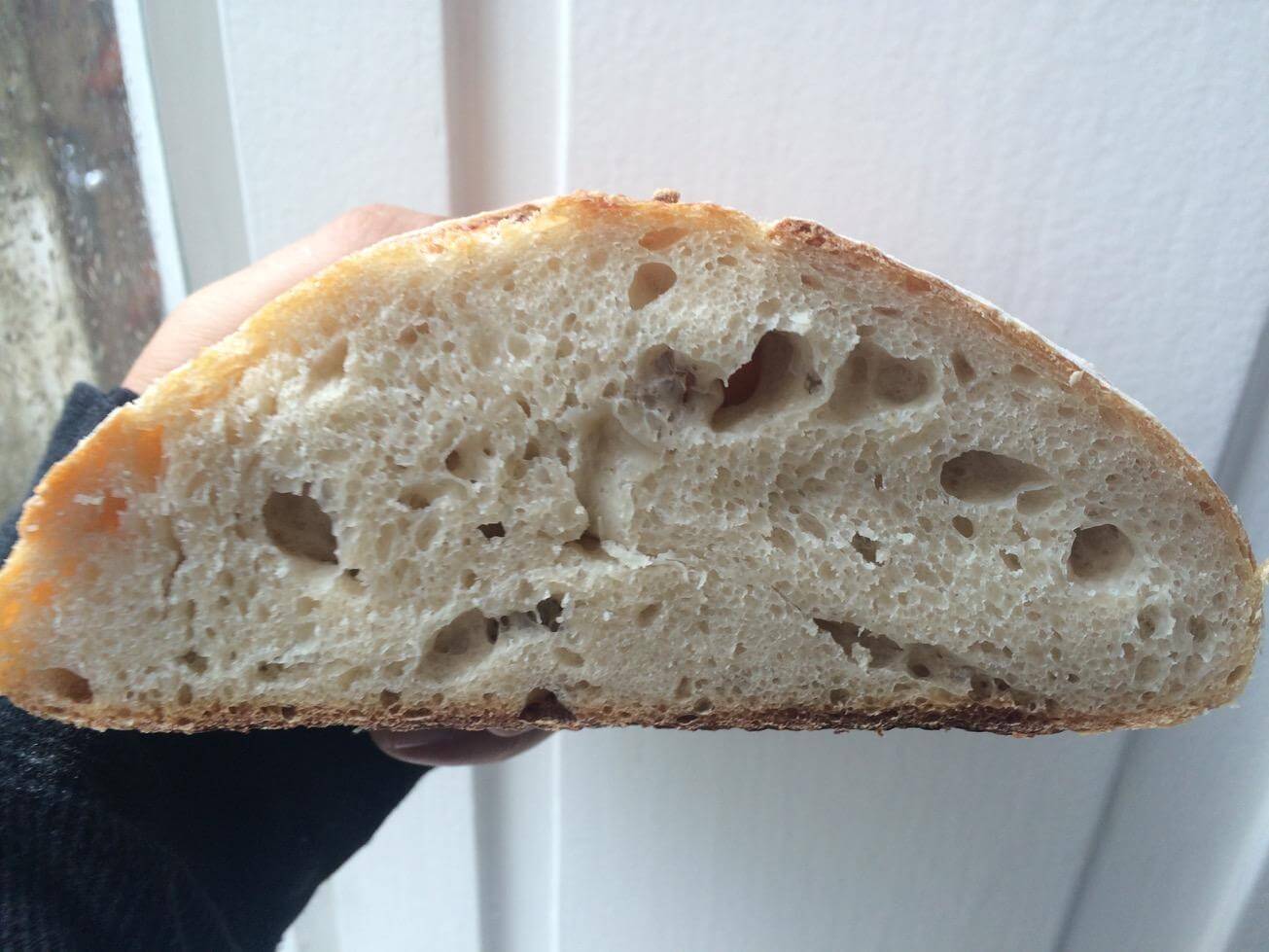 O pão ficou muito bom, mas com o miolo um pouco mais denso do que eu costumo conseguir com as outras, acho que pela pouca água pra uma farinha tão forte, mas talvez a massa pudesse ter fermentado um pouco mais. Gosto bom, casca boa e um bom crescimento no forno (como diz "oven rise" em português?).