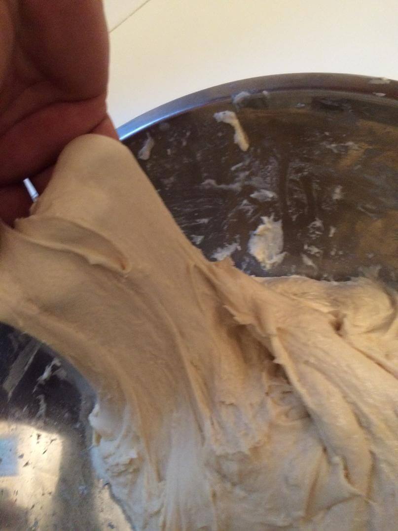 E realmente é verdade, rapidinho o glúten se desenvolve muito. De tal maneira que não dá pra fazer um painel de janela(??)(window pane) não por não ter estrutura suficiente, mas porque esta estrutura está muito apertada. Depois de um descansinho faz.
