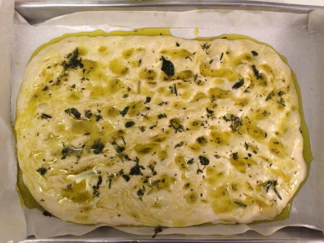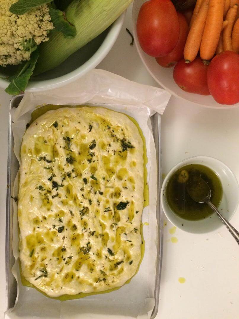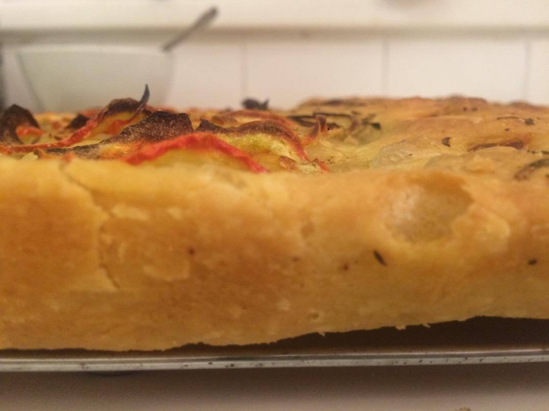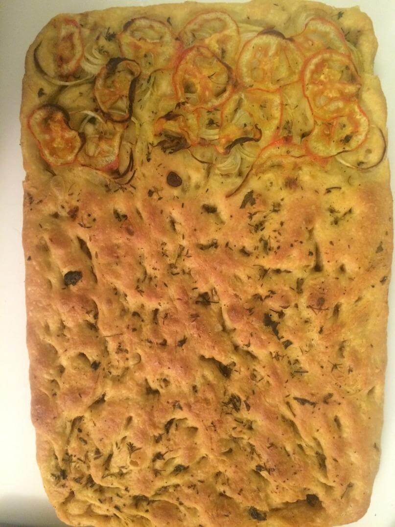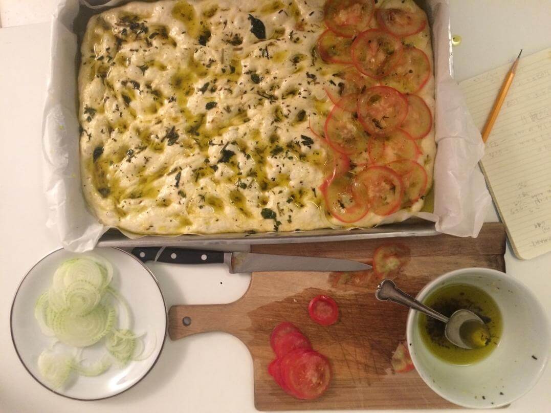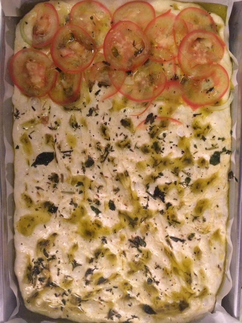 Depois moldei na forma e cobri de azeite com as ervas, proofa na forma mais um bom tempo (aqui que devia ter ido pra geladeira até a manhã seguinte), mais azeite, numa parte botei fatias finíssimas de tomate e cebola. Não é bom botar nada muito pesado pra não atrapalhar o crescimento da massa.