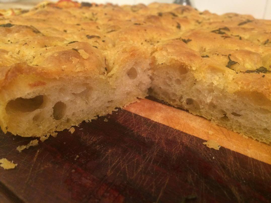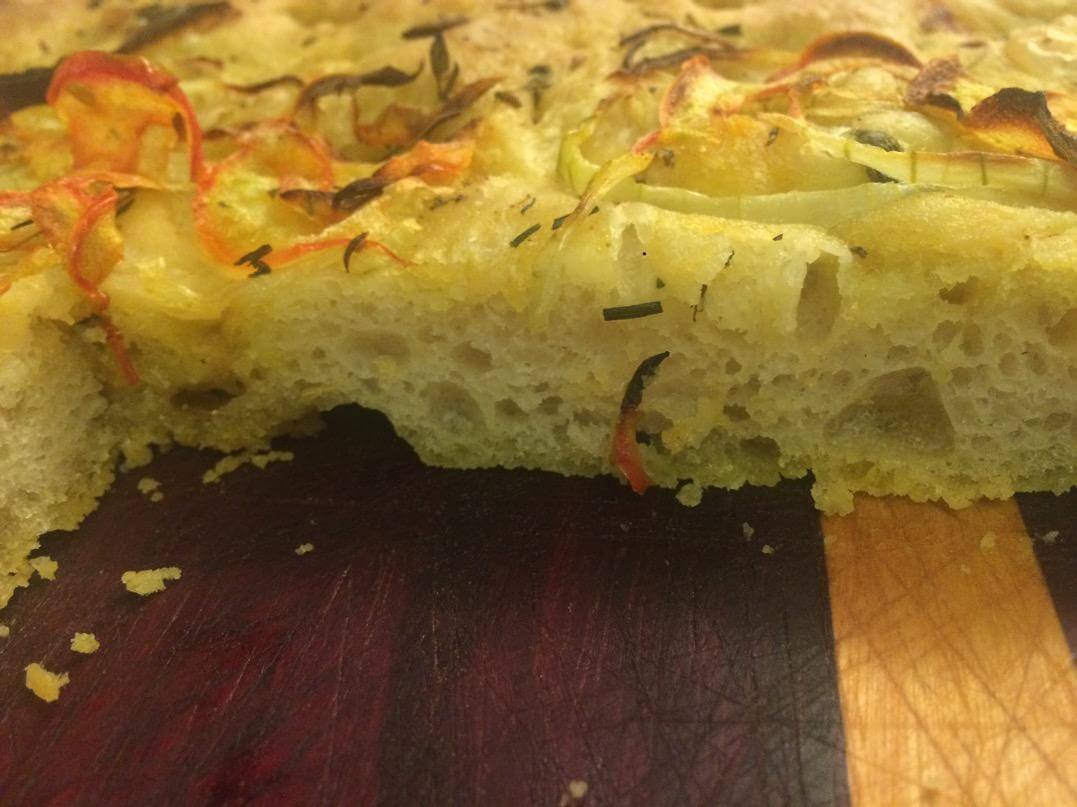 Fiz esta focaccia baseadas na receita do Peter Reinhart, só que adaptei pra fermento natural.